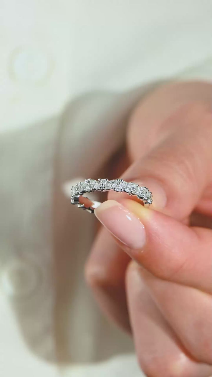 An elegant wedding band crafted in 18K gold, featuring a refined mix of marquise and round brilliant lab-grown diamonds for balanced sparkle and visual interest. The combination of diamond cuts adds movement and sophistication, creating a timeless design that stands out without feeling overstated. Perfect as a wedding band, stacking ring, or a complementary piece alongside an engagement ring.