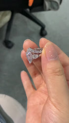 This stunning ring set is a perfect blend of luxury and elegance. The main ring features a captivating pear-cut lab-made large diamond as its centerpiece, weighing over 3 carats, surrounded by sparkling side lab-made diamonds of the highest clarity and color that enhance its brilliance and sophistication. Paired with a beautifully crafted wedding band adorned with shimmering lab-made diamonds surrounding it, this set symbolizes love and commitment. Its timeless design and exquisite craftsmanship make it an ideal choice for marking life’s most cherished moments.